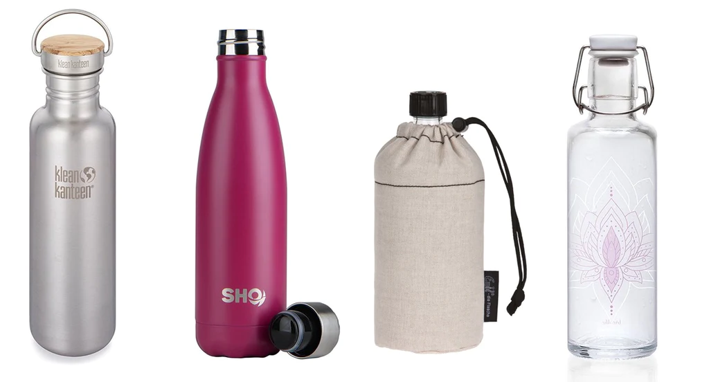 Trinkflaschen aus Metall von (1) klean kanteen und (2) SHO; Trinkflaschen aus Glas von (3) Emil und (4) Soulbottles