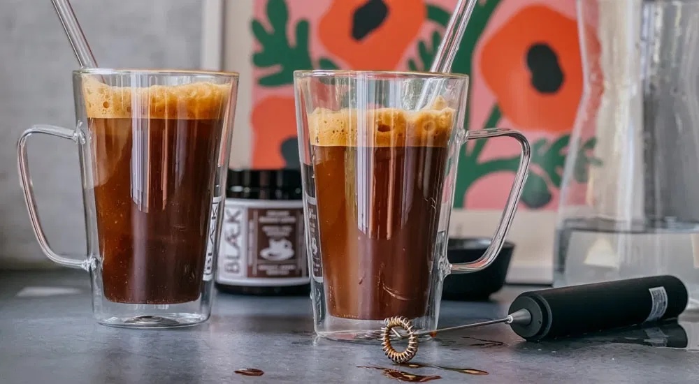 Für klassischen Café Frappé kommt nach griechischem Vorbild Instantkaffee zum Einsatz. Da uns guter Geschmack am wichtigsten ist, nehmen wir Specialty Instant Coffee von BLAEK, genauer gesagt die kräftige Columbian Dark Roast. Damit haben wir überraschend viel Schaum hinbekommen, und das Ergebnis war sehr aromatisch. Du kannst natürlich auch anderen Instantkaffee verwenden. Bitte verzichte aber auf kalorienreiche, fertige Frappé Mixgetränke, die außer Kaffeepulver noch Aromen und Zucker enthalten – das muss nicht sein!