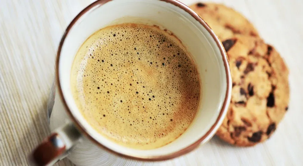 Ebenfalls offensichtlich: Unechte Crema weist keine feine, sondern eine grobe Blasenstruktur auf. Gibst du einen Löffel Zucker darauf, wird er sofort von der „Fake Crema“ geschluckt, anstelle von ihr getragen zu werden. Das ist nix! Sieht dann in etwa so aus wie auf dem folgendem Bild – auf dem wahrscheinlich nur der Keks lecker ist.