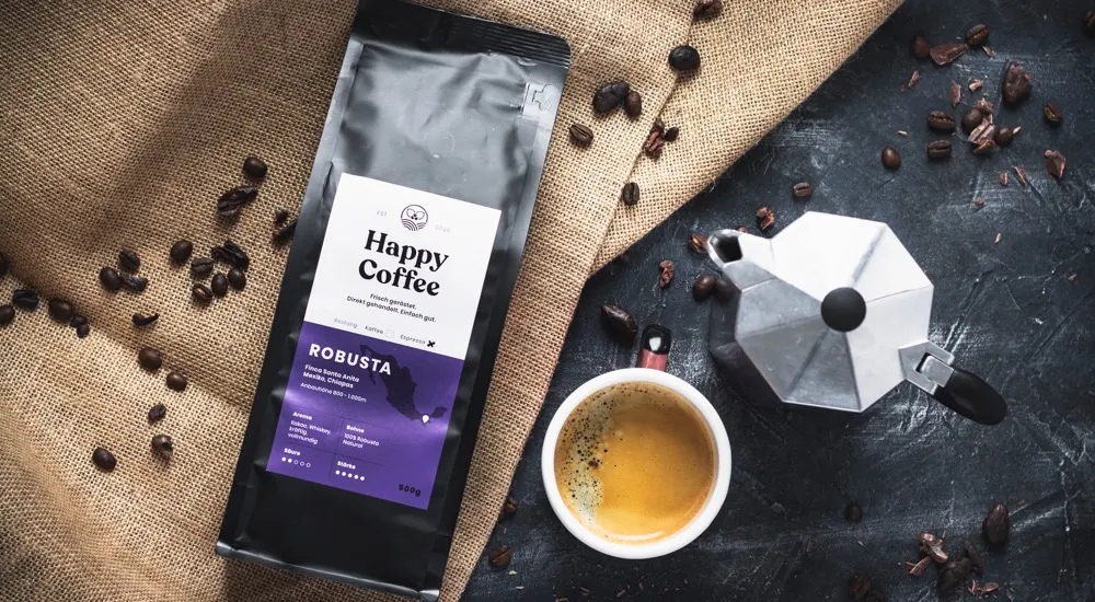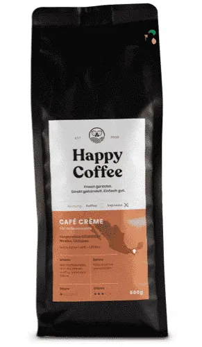 Wenn du noch etwas experimentierfreudiger bist und die dickste Crema aller Zeiten möchtest, dann probier mal unseren Happy Coffee Robusta aus! Der besteht zu 100% aus Robusta-Bohnen, und zaubert deshalb eine Wahnsinns-Crema – was übrigens daran liegt, dass Robusta einen geringeren Gehalt an Lipiden (Kaffee-Ölen), dafür nach dem Rösten aber einen höheren CO2-Anteil hat. Und auch geschmacklich ist ein Fine Robusta so gut, dass er sich hinter Arabicas und Blends wirklich nicht verstecken muss. Unserer ist sehr intensiv: Etwas Schoko, und etwas Whisky! Arne von Coffeeness sagt: