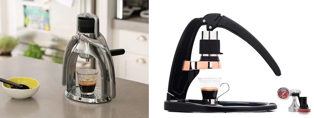 Kleine Handhebelgeräte: (1) ROK Espresso mit zwei Armen, (2) Flair Espressomaschine mit einem Hebel