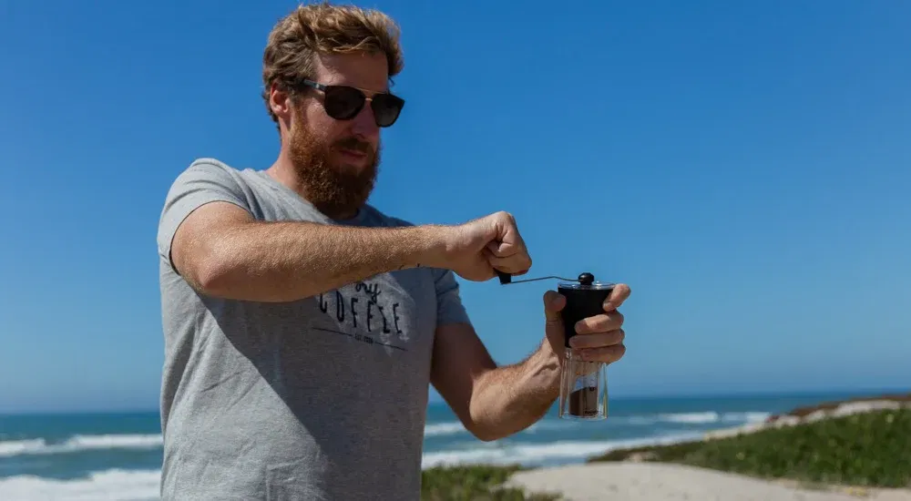 Oben auf dem Foto siehst du Christian von Happy Coffee, der es sich sogar unterwegs beim Campen am Strand nicht nehmen lässt, die Kaffeebohnen frisch in der Hario Mini Mill (ca. 35 Euro) zu mahlen! Und bequeme elektrische Kaffeemühlen für Zuhause wie z.B. die Rommelsbacher gibt es auch bereits für 40 Euro.