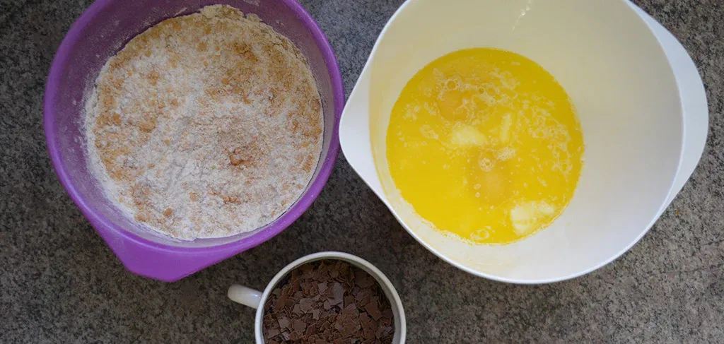 Jetzt mischt ihr Mehl, Zucker, Backpulver, Salz und den Espresso in einer kleinen Schüssel miteinander. Die Butter wird in einem Topf zerlassen und anschließend mit Eiern, Milch und Vanillezucker in einer großen Schüssel verrührt. Nun gebt ihr langsam die Mehlmischung zu den anderen Zutaten und verrührt alles gut miteinander. Am besten geht das mit einem Handmixer oder einer Küchenmaschine.