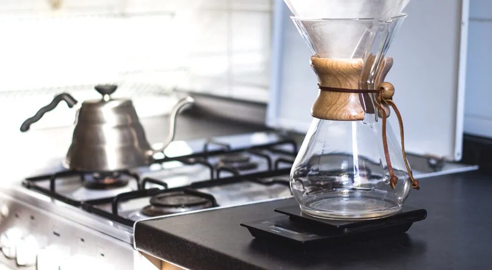 - Manuelle Kaffeebereiter wie die Chemex, die Hario V60 Kanne oder die French Press kannst du nach erneutem Tarieren direkt auf deine Kaffeewaage stellen, um während des Brühvorgangs den Output (Kaffeemenge in Gramm) zu kontrollieren. Bei der Aeropress, die du per Hand drückst, oder bei einer Filterkaffeemaschine mit Warmhalteplatte geht das eher nicht. Vorheriges Abwiegen von Mahlgut und Brühwasser macht dennoch Sinn!