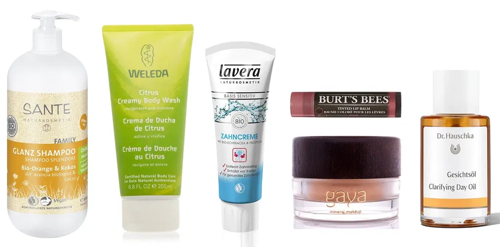 Naturkosmetik Klassiker: Sante Glanzshampoo, Weleda Citrus Body Wash, Lavera Bio Zahncreme, Burt’s Bees Lip Balm, Gaya Mineral Make Up, Dr. Hauschka Gesichtsöl