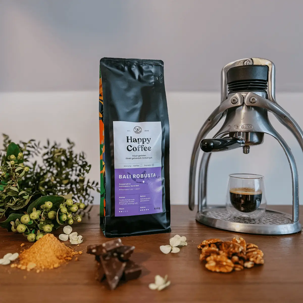 Unser indonesischer Robusta stammt von einer Kooperative aus dem Norden der Insel Bali. Eigentlich wird die Tieflandbohne in niedrigeren Höhenlagen angebaut, doch hier wachsen die Kaffeepflanzen au 1.200 bis 1.500 Metern Höhe auf fruchtbarem Vulkanboden. Das Ergebnis ist ein besonderes Geschmacksprofil, das wild-charakteristisch und doch sehr ausfällt.