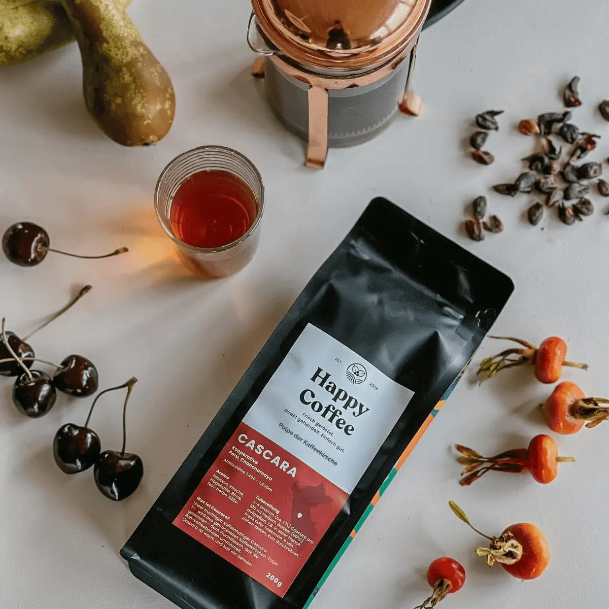 Bei Cascara handelt es sich um getrocknete Pulpe der Kaffeekirschen: Das rote Fruchtfleisch, welches die Rohbohnen ummantelt. Im Zuge der Kaffeeaufbereitung wird die Kaffeekirsche von den grünen Bohnen gelöst und zur weiteren Verarbeitung getrocknet. Während sich Kaffeefarmer in den Anbauländern schon seit Ewigkeiten Heißgetränke aus der Pulpe der Kaffeekirschen brühen, ist das nachhaltige Produkt in Europa noch relativ neu – gewinnt aber zunehmend an Beliebtheit.